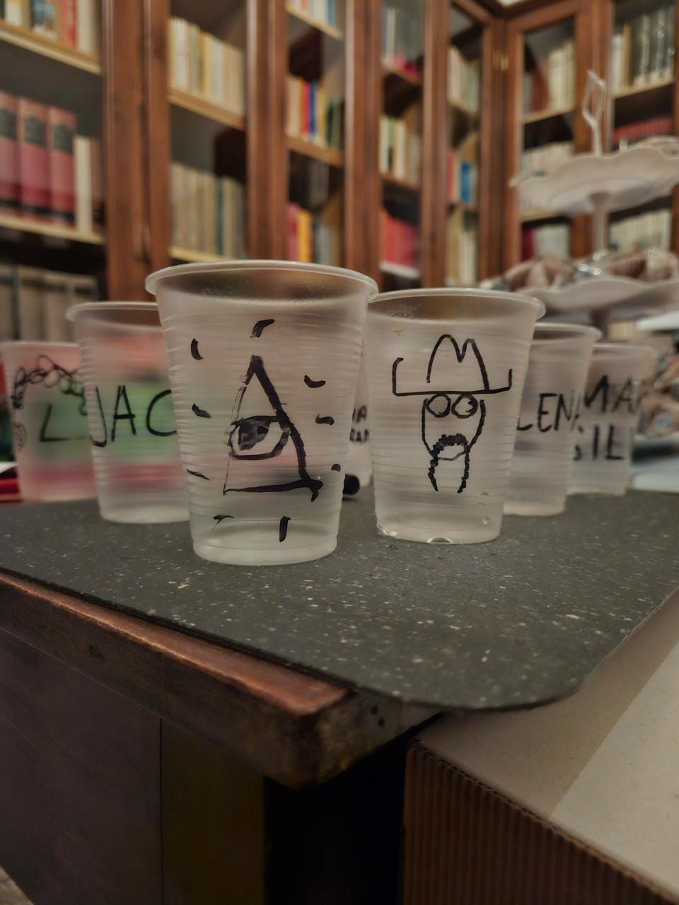Vi rubiamo giusto un altro istante per condividere qualcosa che è riemerso recentemente quando, nostalgici e desiderosi di fomentare l’hype per il PALACE di quest’anno, ci siamo messi a rivedere le fotografie dell’anno scorso. Dovete sapere che alla sinistra del palco c’è uno stanzino, diciamo riservato, una sorta di backstage, di angolo di decompressione, dove staff e ospiti possono rifocillarsi e recuperare. Come alle feste di compleanno delle medie, ciascuno ha il proprio bicchiere di plastica che deve rendere riconoscibile. Differentemente dalle feste di compleanno delle medie, qui ci sono figuri del calibro di Giovanni Eccher e Davide La Rosa, e quindi la personalizzazione dei bicchieri si è trasformata nel pretesto di una mostra d’arte a sé stante.